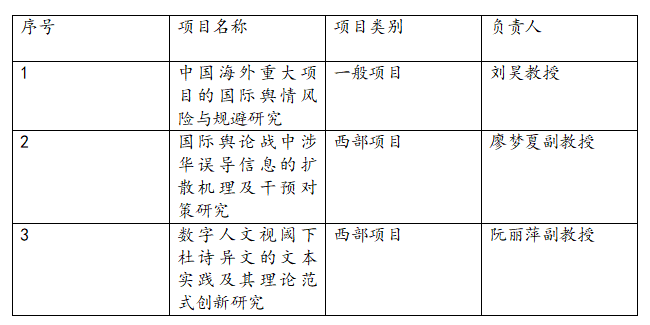 其中,刘昊教授负责的《中国海外重大项目的国际舆情风险与规避研究》获批年度一般项目立项,廖梦夏副教授负责的《国际舆论战中涉华误导信息的扩散机理及干预对策研究》、阮丽萍副教授负责的《数字人文视阈下杜诗异文的文本实践及其理论范式创新研究》获批西部项目立项。
