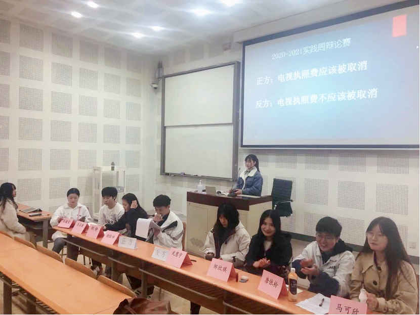11月4日,由太阳成集团tyc33455,太阳成集团官方网站主办的校级实践周辩论赛于教学楼B2-1举行。双方辩手经过最初班级淘汰赛的层层筛选,最终由来自2018级广播电视学7班的徐佐帅、胡静、肖正绪、张凝雪组成正方,来自2019级广播电视编导6班的武慧宇、邹欣琪、唐依柃、马可欣组成反方代表各自班级参加此次辩论赛决赛。双方就“是否应该取消电视执照费”展开了激烈辩论。