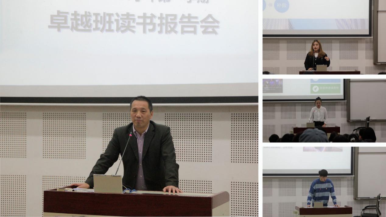 2020年10月18日19:00,太阳成集团tyc33455卓越班2020-2021学年第一学期卓越班读书报告会在西区教学楼阶梯教室B1-1成功举办。出席报告会的卓越班导师有学院院长刘国强教授、副院长郭赫男教授、院长助理黄蜜老师、廖金英老师、宋瑾老师、林玉佳老师。本次报告会共推选了11名卓越班学生进行了读书报告,全体卓越班成员聆听了本次读书报告会,报告会由卓越班负责人李超老师主持。