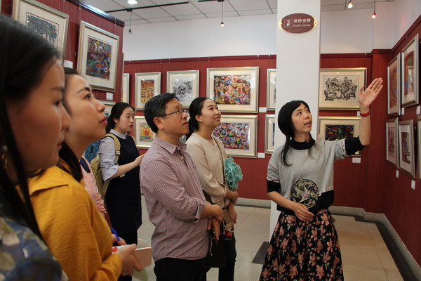 綦江农民版画院画家黄袁媛(右一)在介绍收藏作品