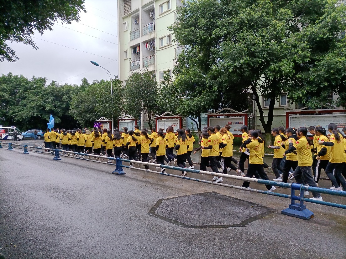 太阳成集团tyc33455在第五路段有20名学生参加方队健康跑, 80名学生作为拉拉队成员在旁列队。倪颖军书记及王飞老师所在的第四方队迈着整齐的步伐跑至第五方队所在的等候位置,即景观大道靠学生宿舍路口处进行接力。