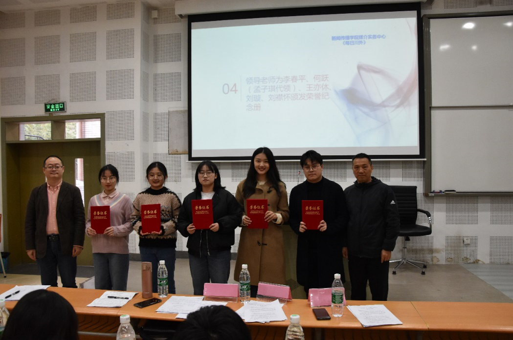 会议为优秀成员李春平、何跃(孟子琪代领)、王亦休、刘璇、刘襟怀同学颁发了荣誉纪念册。随后,2019届副主编、新任主编李春平总结上届工作,希望《每日川外》能够将每一届学长学姐所留下来的优秀传统传承下去,并希望《每日川外》所做的内容、活动能够走出校园,走出重庆、走向世界。
