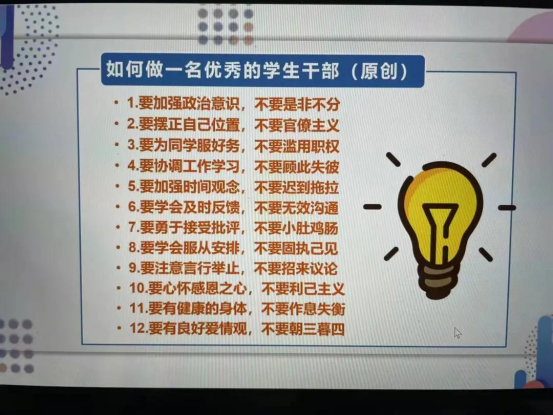 最后,任晓丽书记强调要杜绝官威思想,明确学生干部要紧紧跟着党走,为同学、为人民服务。