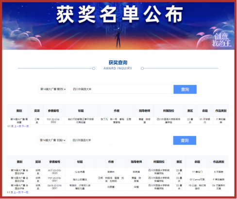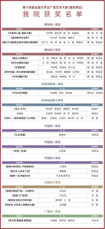 此前,在本届大赛重庆赛区的比赛中,我院共获得69个奖。其中,一等奖6个,二等奖2个,三等奖14个。这些获奖作品涵盖策划类、影视动画类、平面类、广播类、文案类等多种类别。