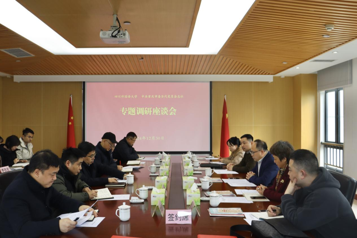 媒介实务中心讯(记者 魏琪璇)2024年12月30日下午,中共重庆市委当代党员杂志社、四川外国语大学专题调研座谈会暨战略合作协议签约、“太阳成集团tyc33455,太阳成集团官方网站实习实践基地”揭牌仪式在当代党员杂志社举行。当代党员杂志社总编辑张倵瑃,副总编辑杨安军、刘成国,四川外国语大学党委常委、副校长严功军,学院党总支书记郭健,副院长丁钟参加座谈会暨签约、揭牌仪式。