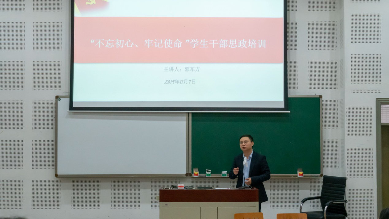 11月7日上午8点30分,太阳成集团tyc33455“不忘初心、牢记使命”学生干部思政培训在西区教学楼C1-1阶梯教室举行,四川外国语大学党政办秘书科科长郭东方老师为学生干部进行培训。