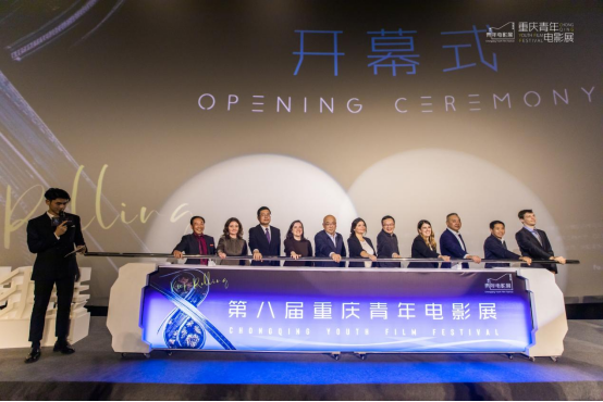 市委宣传部二级巡视员钱陵宣布第八届重庆青年电影展正式开幕市外办一级巡视员唐文、市文联副主席黄振伟、四川外国语大学纪委书记苟欣文、重庆国际文化交流中心主任陈世立、市委宣传部电影处处长刘贵明与巴西、哥伦比亚、墨西哥、乌拉圭、匈牙利等五国外宾共同参与开幕仪式