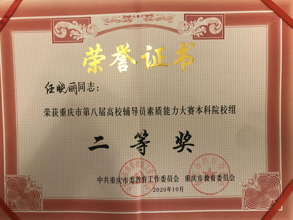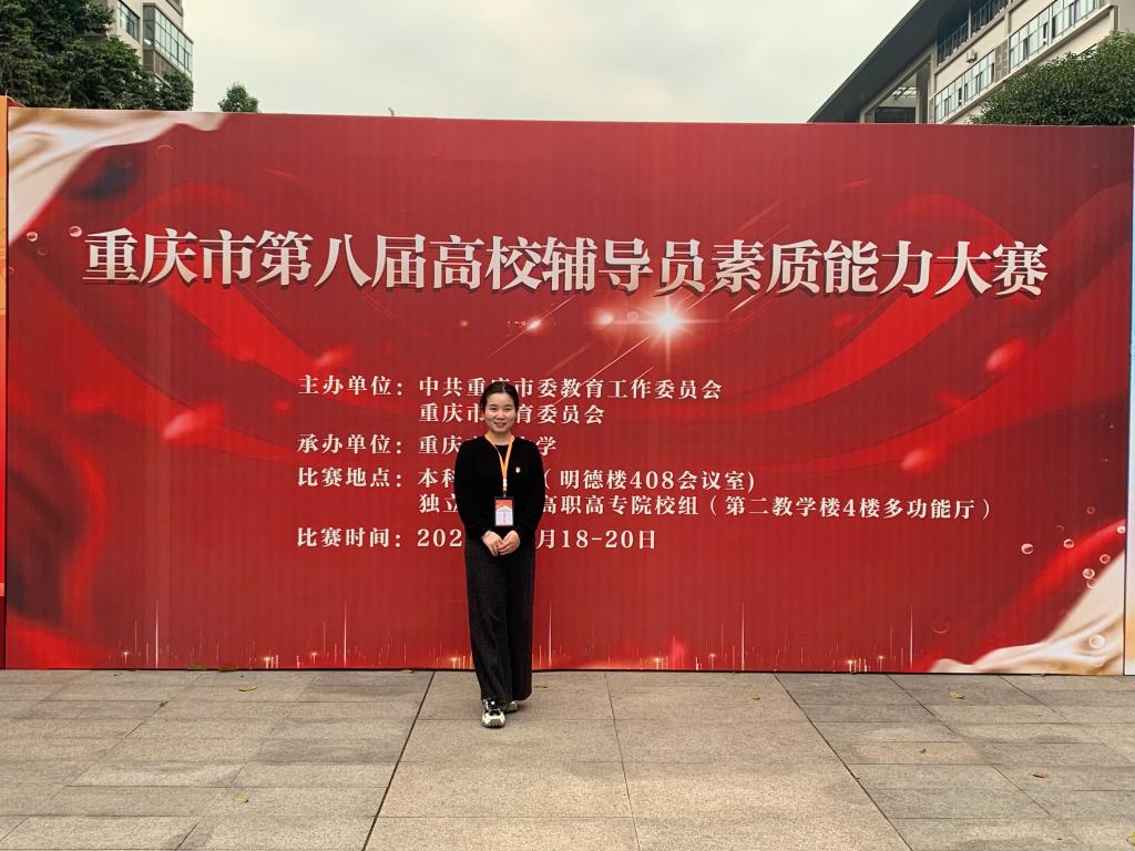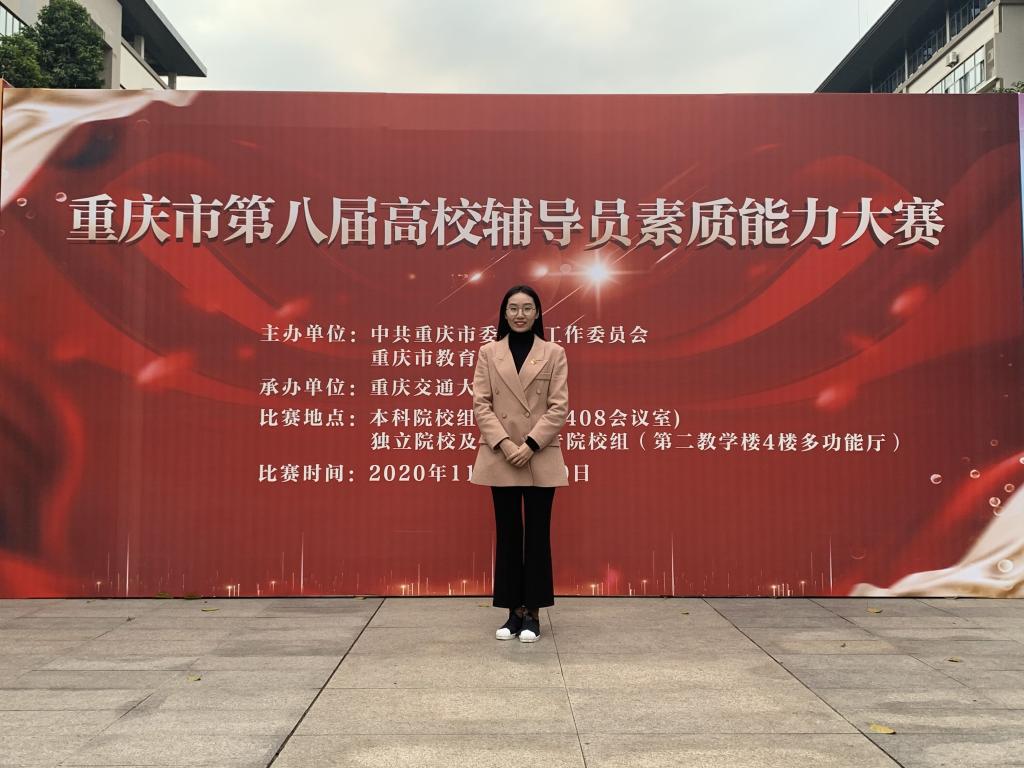 11月20日,由中共重庆市委教育工作委员会举办的第八届高校辅导员素质能力大赛在重庆交通大学顺利举行,我院辅导员任晓丽老师在比赛中喜获二等奖,同时,李超老师也取得了22名的佳绩。