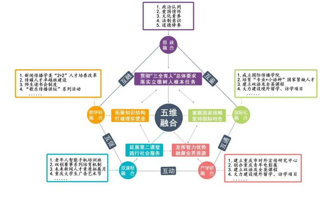四川外国语大学新闻传播学科和戏剧与影视学科近年围绕“国际视野、复合融通、理实并重”的人才培养定位,根据社会和媒介变迁新形势对传媒人才培养的新要求,不断探索教育教学改革路径,形成了“五维融合”的人才培养新模式。