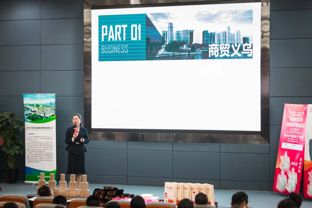 刘亚琴女士讲到,义乌被称为世界小商品之都,随着互联网的兴起,义乌小商品市场不但没有走向衰败,反而获得了新生。她强调义乌是中小微企业走向世界的平台,她还说:义乌是一座没有围墙的城市,只要你有想法,你就可以来实现你的梦想。她提示同学们可以从发生在义乌的创业故事中获取创作灵感。