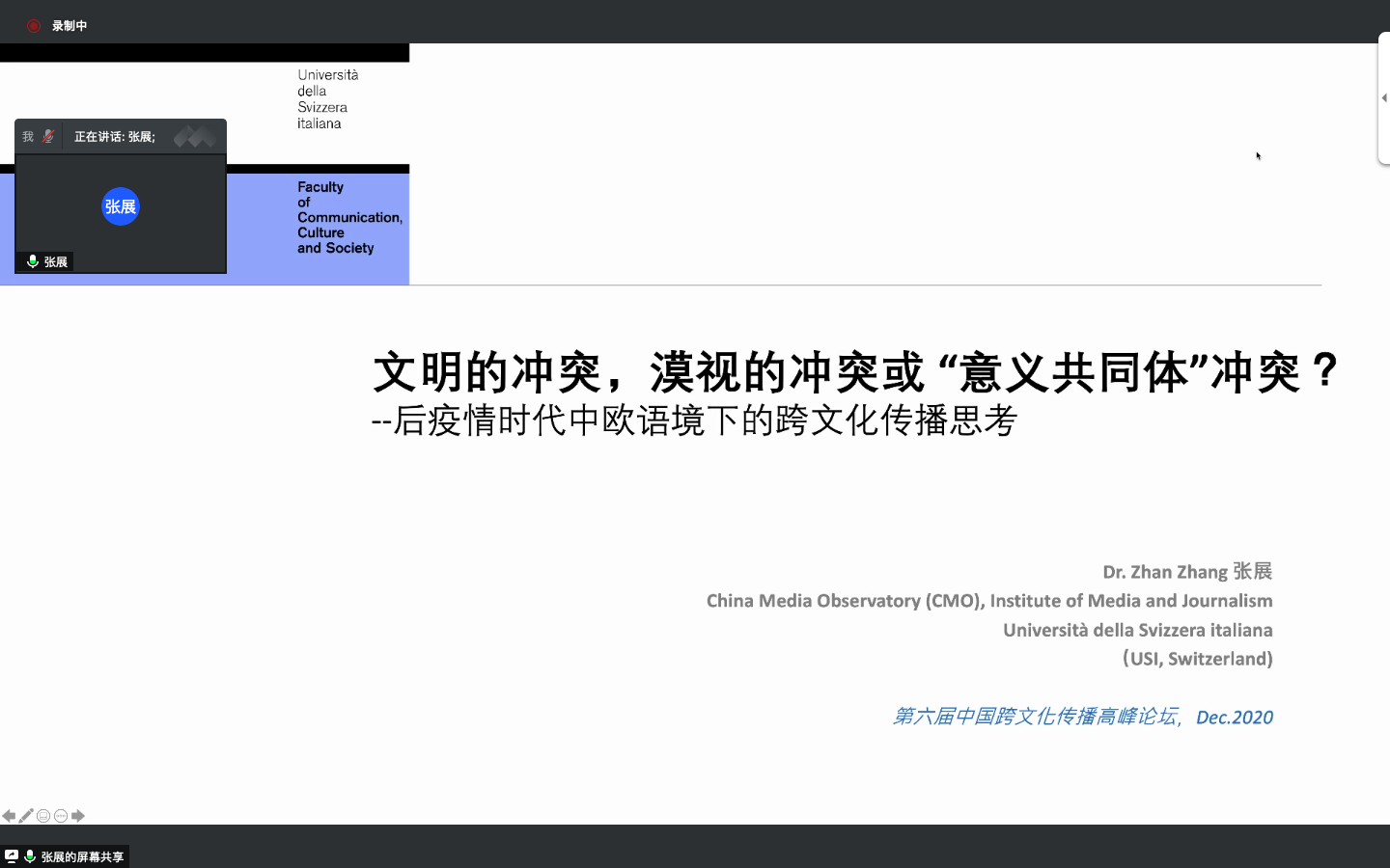 瑞士卢加诺大学传播文化与社会学院研究员张展发表了题为《文明的冲突,漠视的冲突或“意义共同体”冲突?》的发言。内容包括:一是新冠疫情之下国际传播秩序的变化;二是文明的冲突,漠视的冲突或“意义共同体”冲突;三是新冠疫情之下中欧跨文化传播的三重困境,分别是生平情境与现有知识库框架差异、视角/经验互易性与自反性屏障、开放领域局限与重复式内在化持续构建;四是如何利用已有传播渠道与技术手段实现中欧之间良性信息循环。