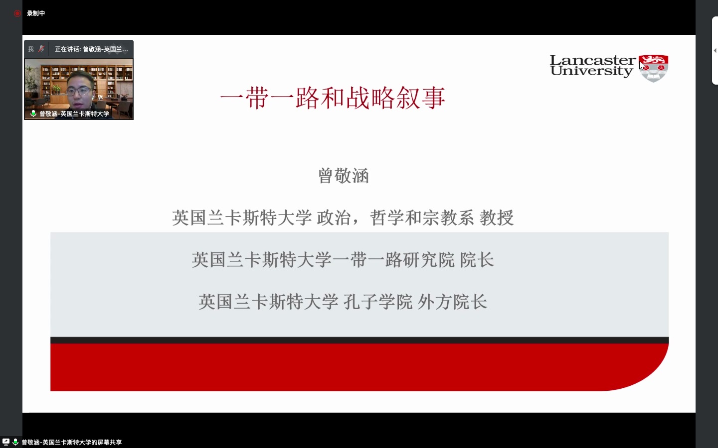 英国兰卡斯特大学孔子学院院长、教授曾敬涵做了《国际战略叙事和"一带一路"》的发言。曾敬涵教授以“战略叙事”这个词的概念开篇,认为在战略叙事的框架下有助于国家与政府提供好的框架来传播好中国声音,讲好中国故事。他认为双方如果能够很好的沟通,形成共同的话语,各国之间才能进一步推广“一带一路”,能够在“一带一路”上实现真正的双赢。