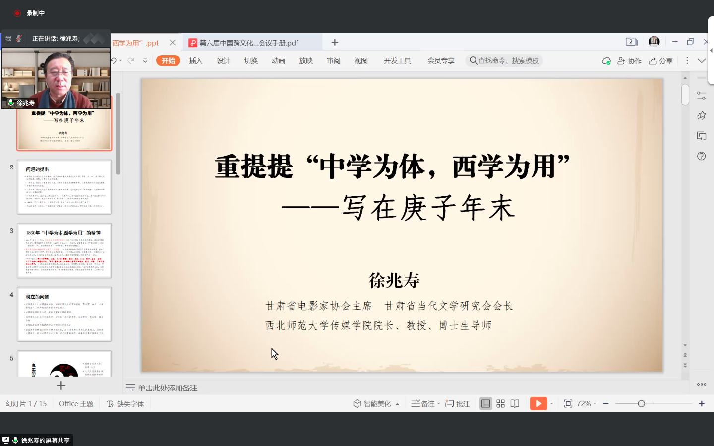 西北师范大学传媒学院院长、教授、博士生导师徐兆寿发表了题为《重提“中学为体,西学为用”》的发言。中国文化有宏观世界观,西方科学是微观世界观。马克思、存在主义、柏格森主义等都强调感性,“解放感性”,相互印证,共同发展。在对外传播中,中国人首先对自己的文化要有正解,如此,世界便有正解。