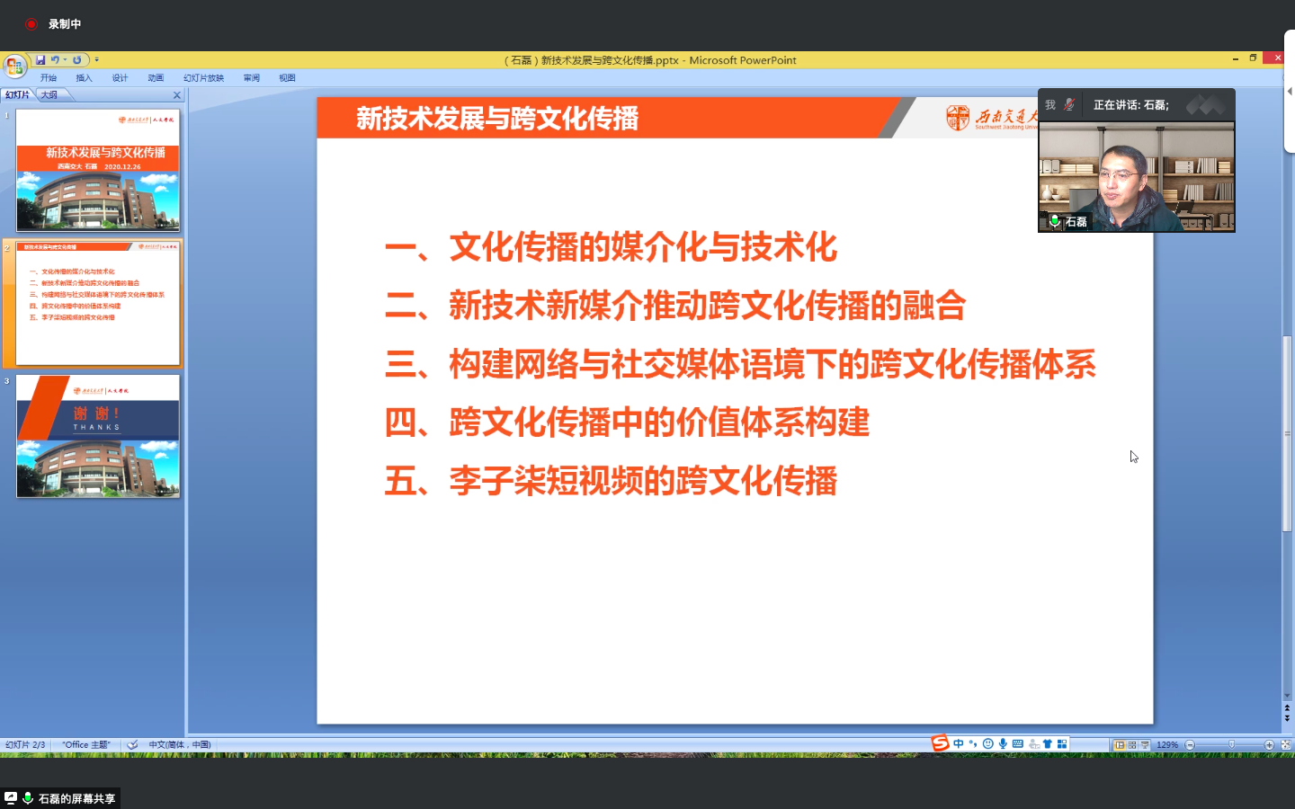 西南交通大学人文学院院长、教授、博士生导师石磊发表了题为《新技术发展与跨文化传播》的发言。他指出,跨文化传播呈现了很多新的特点。在新技术的推动下,一是文化的融再是跨媒体的媒体融合。在此情况下,我们要构建的系统工程,传播主体、渠道、内容、形式、手段等都应与当今的新技术相适应。
