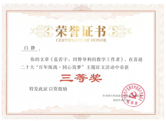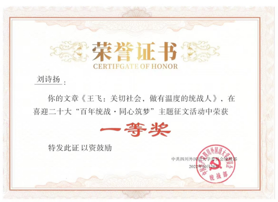 由学校党委统战部主办的喜迎二十大“百年统战 · 同心筑梦”主题征文日前结束。征文评出22篇获奖作品,我院6篇作品获奖,其中,2020级本科生、《川外新传》首席记者刘诗扬获一等奖 ,另有5名同学分别获得二等奖和三等奖。