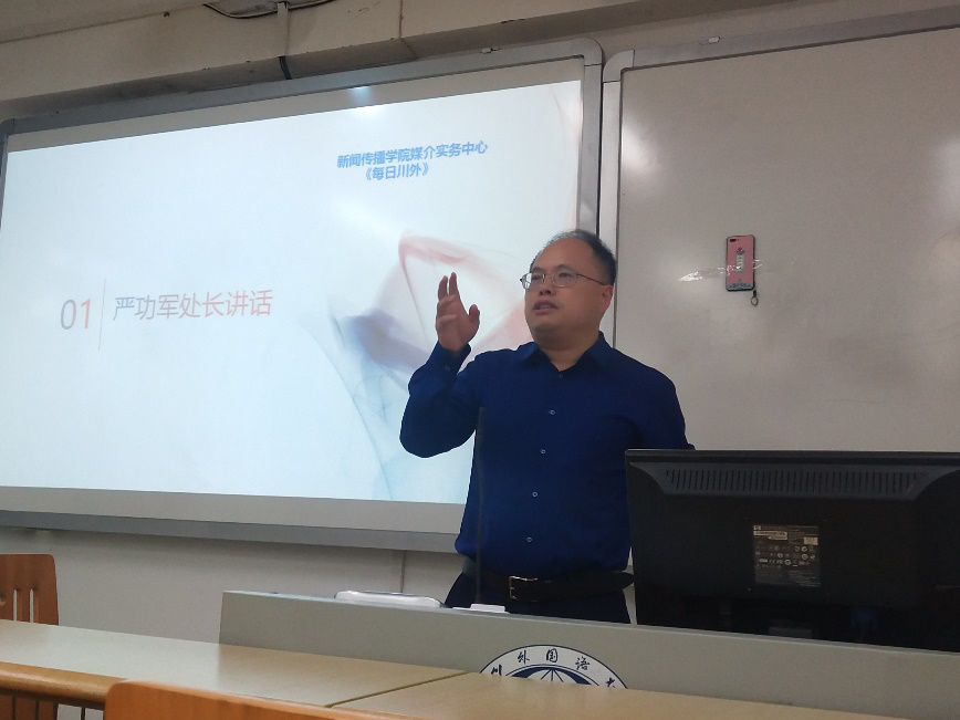 学校教务处处长、《每日川外》总编辑严功军发表讲话。他希望同学们在新闻传播的学习和实践中要思考和践行六个字——“走出来,走进去”,即:走出传统媒体思维,拥抱万物皆媒时代;走进主流媒体,练就信息传播和舆论引导本领。他对《每日川外》的发展提出了令人振奋的建设性思路
