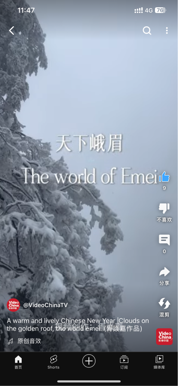 自活动开展以来我院学生积极投稿,创作了大量内容丰富、形式多样的短视频作品。近日,学院胥焱嘉同学的中英双语作品《天下峨眉》登录五洲传播中心在YouTube上的官方频道“VideoChinaTV”,上线即获超400次观看,不仅展示了峨眉山的雪色风光,更让海外观众透过网络,感受到了我国名山大川的秀美壮阔。