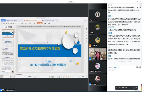 11月15日晚,华中科技大学新闻与信息传播学院教博士生导师牛静教授应邀为我院师生做了一场主题为《实证研究论文的架构与写作逻辑》的线上学术讲座。讲座由我院院长刘国强教授、新闻学系王艳副教授主持,我校及部分外校师生共270余人参加。刘国强院长代表学院非常感谢远在美国的牛静教授带来跨洋学术交流,为师生打开论文写作的大门。