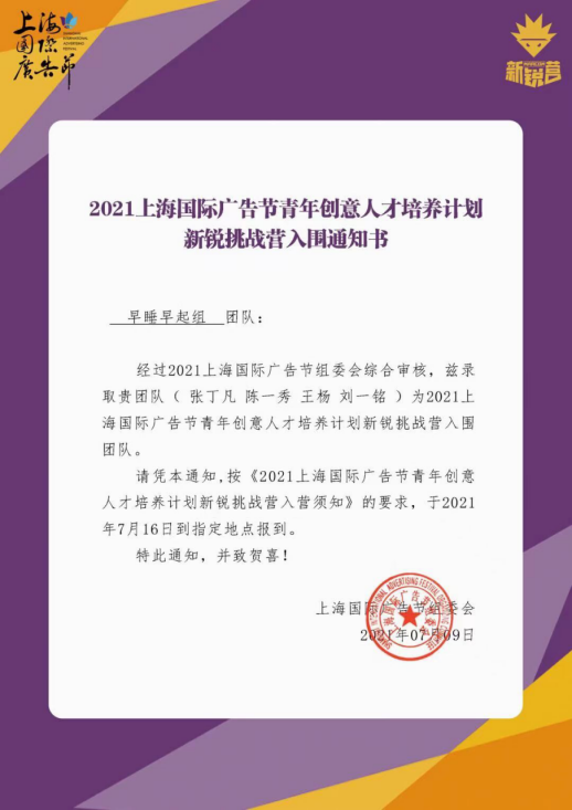 7月9日,在黄蜜老师、陈若溪老师和康何艳老师的指导下,我校2019级广告班的张丁凡、陈一秀、王杨、刘一鸣四名学子组成的“早睡早起组”收到了上海国际广告节青年创意人才培养计划新锐挑战营入围通知书,并于7月16日抵达上海报到。