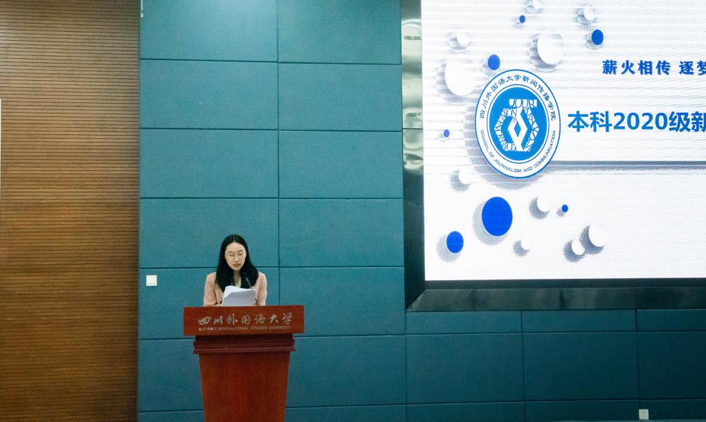 2020级4班的徐佳佳作为新生代表上台发言。她分享未来四年对自己的规划和期望:制定学习计划,充实大学生活;树立规则意识,提升自控能力;常怀感恩之心,争做有用之人。最后,她祝愿大家在川外新传度过丰富的四年生活,踏实走好脚下的路。以不懈奋斗擦亮青春底色、叩响未来之门。