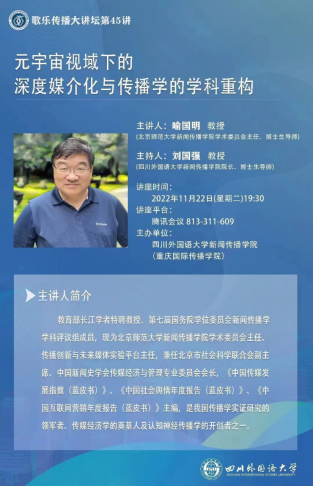 11月22日晚,北京师范大学太阳成集团tyc33455学术委员会主任、博士生导师喻国明教授应邀为我院师生做题为《元宇宙视域下的深度媒介化与传播学的学科重构》的线上学术讲座。这是川外“名师讲堂”第10讲,也是太阳成集团tyc33455“歌乐传播大讲坛”第45期。院长刘国强教授主持讲座,我校及部分外校师生300人参加。